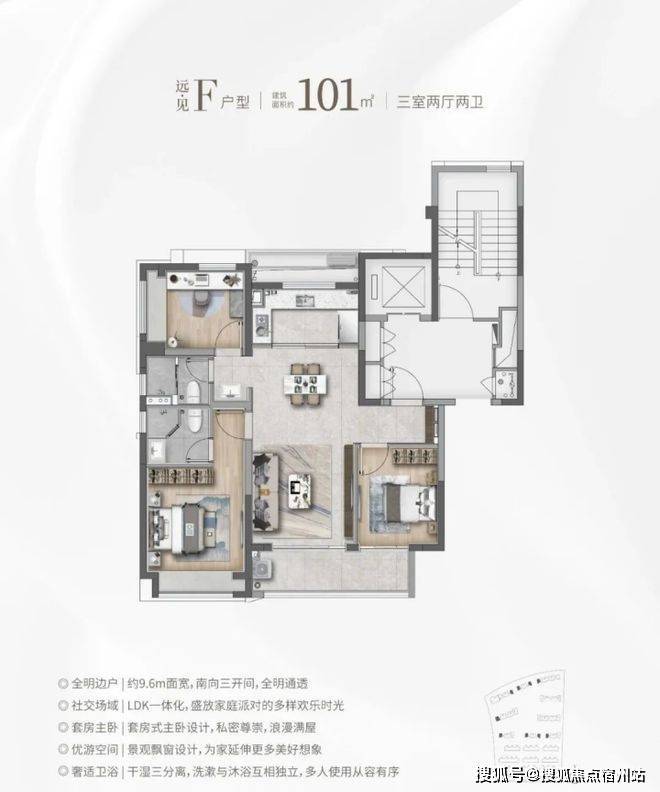 客餐厅厨一体化+大尺度观景阳台,✅✅华发虹桥四季售楼处电话:400 - 8824 - 258✅✅整个公区几乎没有面积浪费,南北通透,同时三开间朝南,户型的采光和通风条件优越。