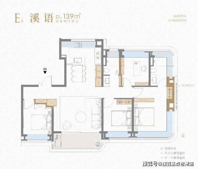 第三处山墙s墙的技术含量更高,直接让户型拥有两个大转角飘窗(主卧+主卫均双270°弧形转角飘窗)。凹处填放一个衣柜,视觉效果舒适,业主第一眼无知无觉,殊不知背后大有玄妙。