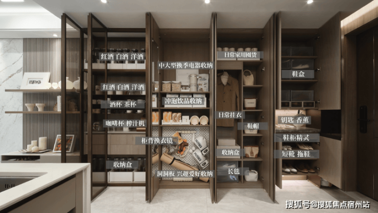全屋收纳系统, 满足一家老小海纳空间!约2.25mx2.4m的超体量玄关柜,为生活扩容,可容纳约56个20寸行李箱,而玄关柜、岛台、卫生间镜柜、主卧衣帽间等空间,把更多隐藏空间打造成超级收纳功能,让未来的生活井井有条。