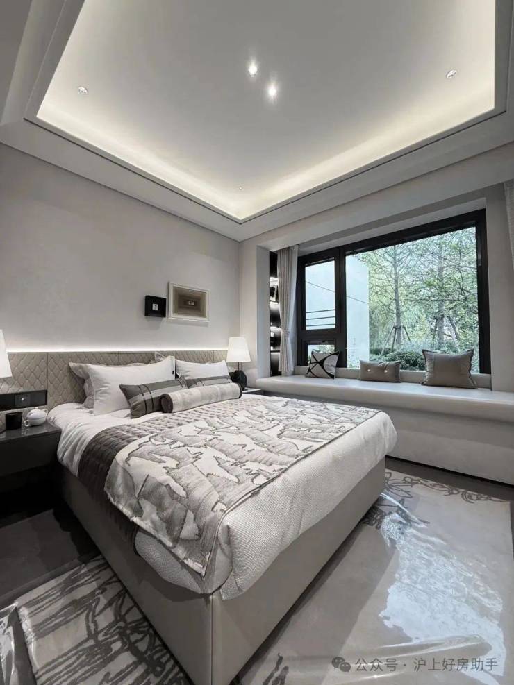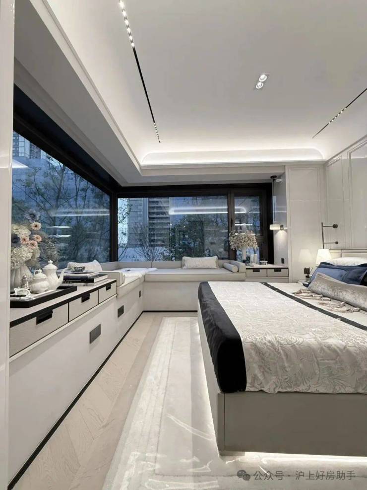 其中主卧的270°转角飘窗就有约5.7m²,通过与外立面的结合,直接做了梳妆台和储物柜,拓展了飘窗的实用性。