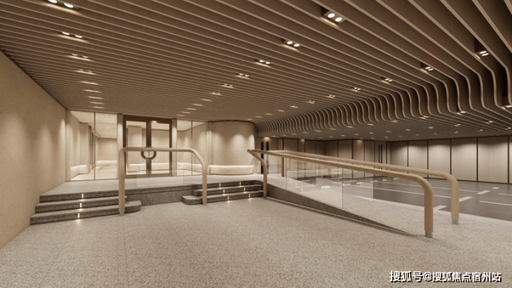 地下二层单元大堂 净高约2.5米,整个空间采用浅色岩板,搭配木纹铝格栅吊顶和落地玻璃门窗,空间通透便利。