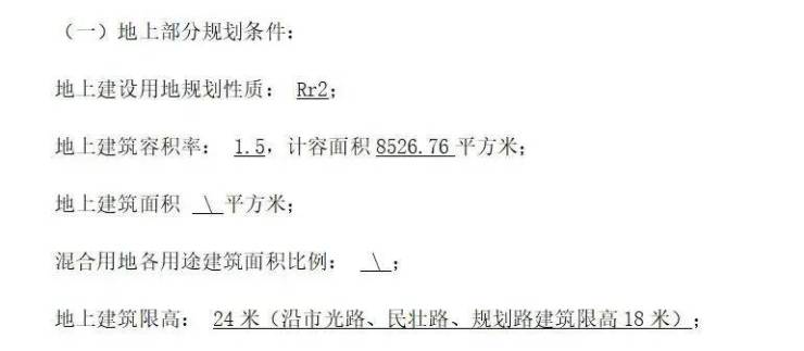 根据出让内容,该地块建筑面积只有约8526.76㎡,容积率为1.5,地上建筑限高为24米,其中沿市光路、民壮路、规划路建筑限高18米。
