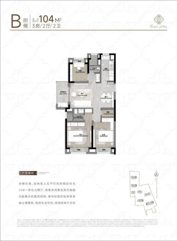 四大轴线:三个入口轴线和中心水轴。全区花园式入户体验,入户门楼结合花坛景墙和别致的地坪铺装,为业主提供尊享、温馨的归家体验。