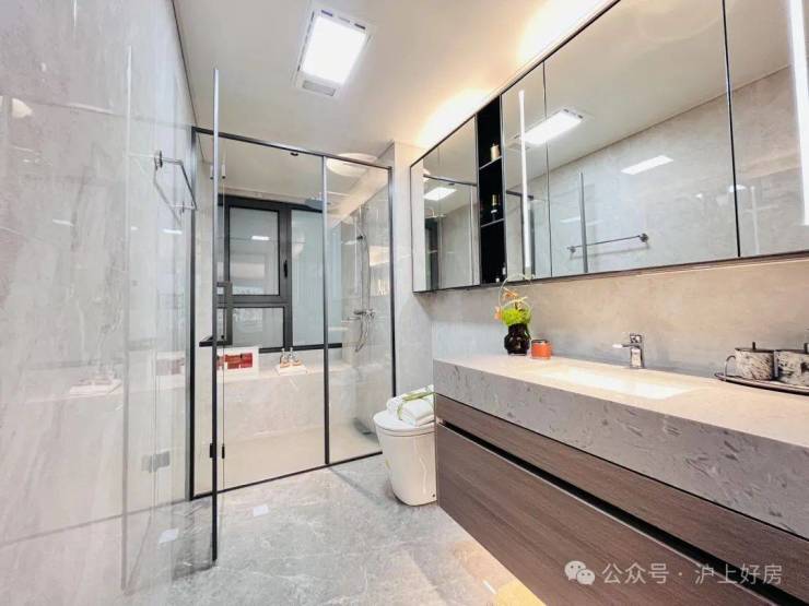在细节上同样不遗余力。比如入户后的玄关柜是交付标准,打开厨房柜体、镜柜等各类收纳空间时均有惊喜;再如客厅和主卧均采用弧形吊顶,还有风暖浴霸、玄关顶面感应灯等细节,都透露出项目对品质生活的追求。