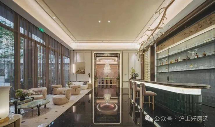 首先是奢石含量极高,从入户处的玲珑玉拼花与透光云石辉映,到翡翠绿奢石墙景、再到 发光云石装饰点亮归家路,石材的典雅贯穿始终。