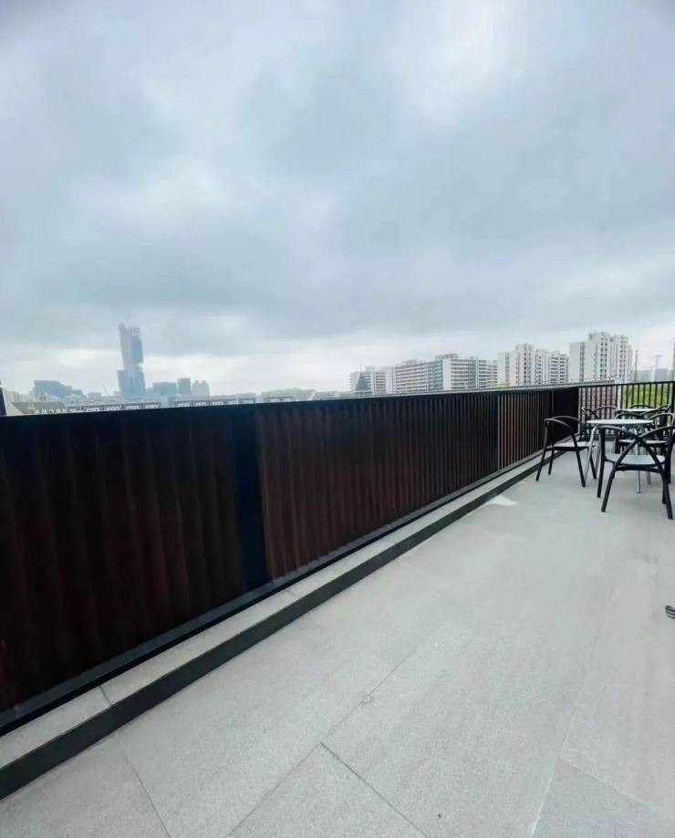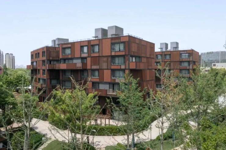 沁风雅苑, 六层木色调的建筑坐落于郁郁葱葱的园林间,大面积玻璃窗、错落的露台,将视野向外延伸,又迎景入室,高低起伏的树篱与藤蔓,巧妙掩住露台和窗口,为建筑带来全新的诠释与解读。
