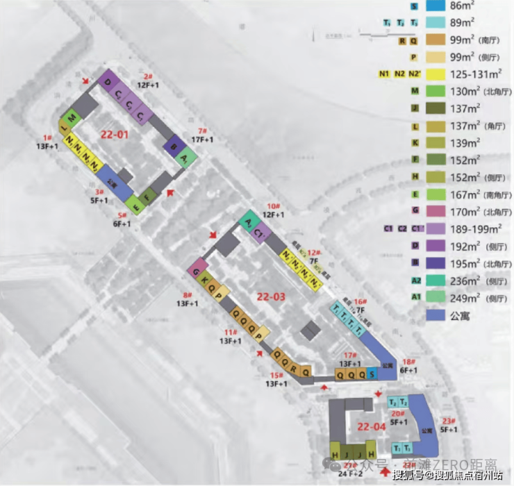 20#、22#总高6-7F,首层为商业,户型为建面约89㎡3房2厅2卫,一梯两户,层高约3.05米;