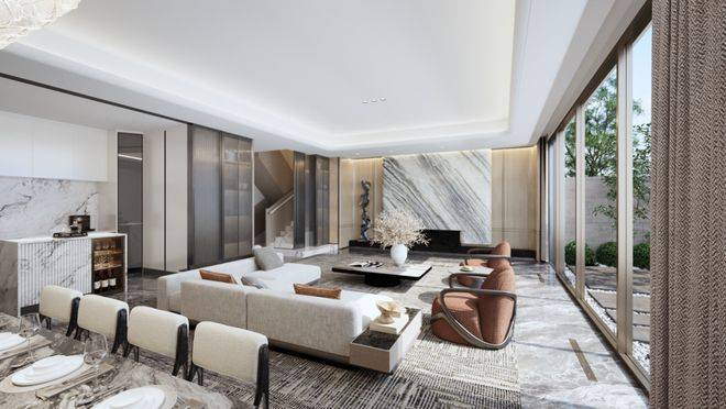 建面约200㎡户型的客餐厅、走道地面,均为冬日恋歌大理石,纹路细腻高级;润雲金茂府售楼处电话☎:400-882-4258【售楼热线】✔✔✔营销中心热☎4008824258售楼处地址☎400—8824—258