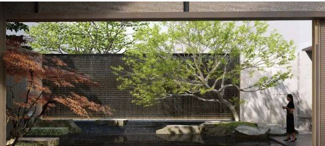 一进院:社区门口的6米宽瀑布景墙+落石+大乔组合,构筑起一道天然噪音屏障,进入瞬时隔离城市喧嚣!