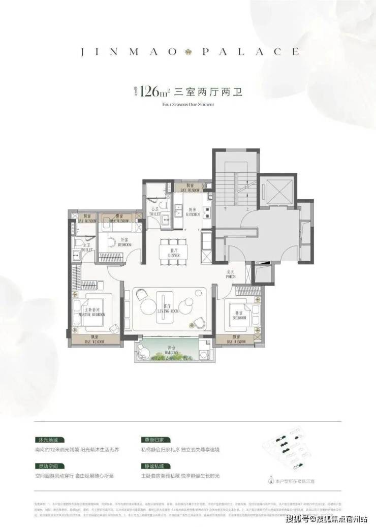 126㎡户型,三开间南向面宽10.8米,全景引光;独立玄关+衣帽间,收纳无忧。