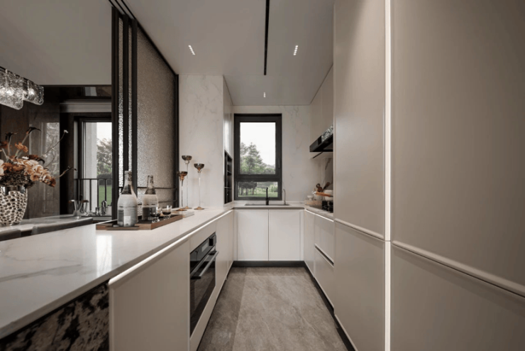 厨房方面,西门子或同档次品牌的燃气灶、抽油烟机、蒸烤箱、洗碗机、嵌入式冰箱五件套;还有细节上的一些配置,例如燃气热水器、末端直饮、凉霸等统统安排上了。