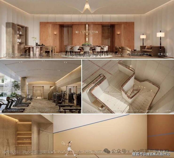 艺术旋转楼梯、地下光厅、区域首创国标壁球馆、飞瀑园景健身房、嵌入式景观书吧 等,深度还原度假酒店质感