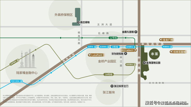 项目位于金桥东,金海湿地公园旁,9/12号双轨交汇,自驾出行的话周边有外环高速、金海高架路、往南还有龙东高架。从通勤角度来看,这是一个去陆家嘴、外高桥、金桥、张江都很方便的地段,可覆盖的人群非常广泛。