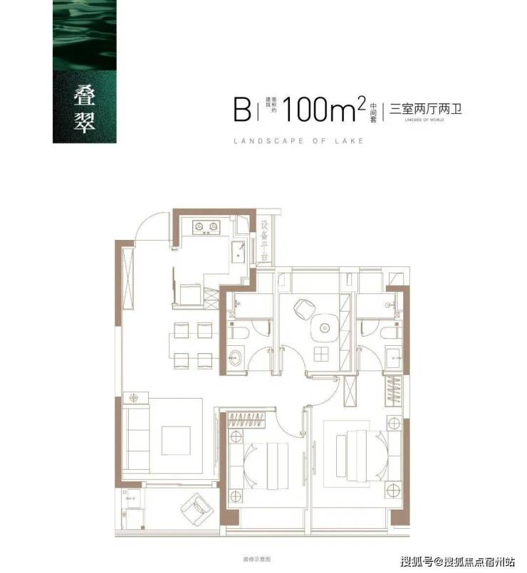 建面约100㎡3房2厅2卫, 做到了三开间朝南+主卧套房设计+动静分离+全卧室带飘窗,功能性和尺度感完美结合的3房户型。