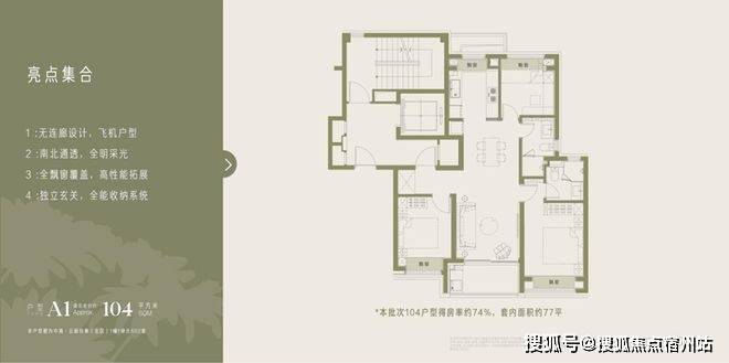 建筑面积约104㎡三房:入主滨江的优质之选:采用“几乎无连廊”设计,保障隐私与通透;三开间朝南,客厅衔接观景阳台,主卧自带独立卫浴;独立八百库玄关+全能收纳系统,让小家庭的日常整洁有序,对比周边11-13.5万/㎡的新盘,性价比优势显著。