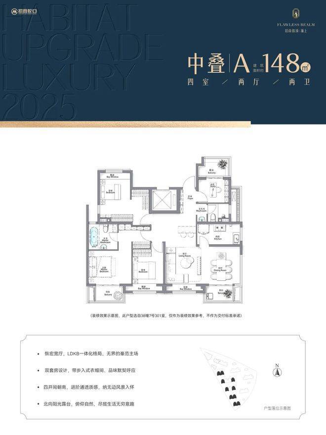 本宣传资料所涉及的户型仅供示意参考。仅为横拟本户型装修效果叠加装修设想进行展示、所示室内装修、家具、陈设、灯具、门窗等除注明外均不在交房范围之中;相同户型因楼栋楼展、单元等差别,局部结构、面积、功能布局、空间分制、门窗/管井形态位置等可能有不同,并且强弱电箱、插座位置等均未在户型围中体现,具体以政府部门及终审定的图纸和《商品房买卖合同》为准,本广告制作日期为2025年7月14日,有效期至2025年8月14日。开发商:上海招宜置业有限公司,推广名:招商臻境。