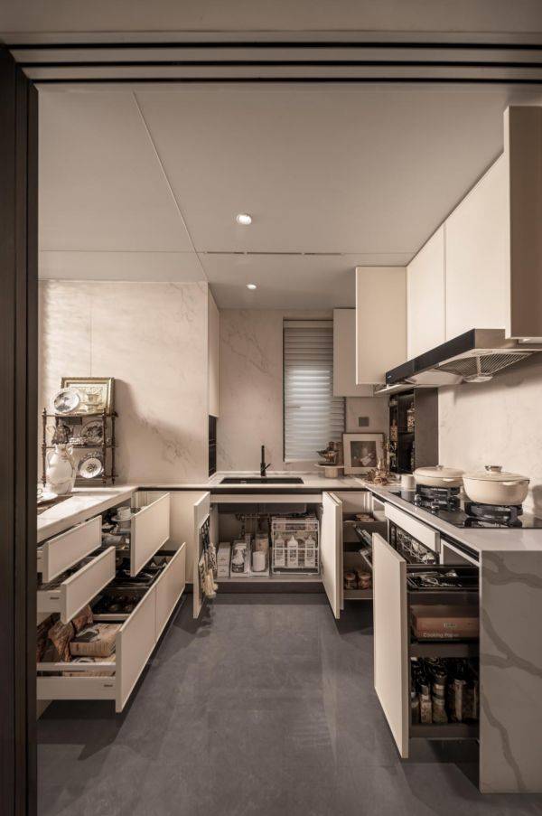 厨房更是堪称美食达人的天堂,集成一系列多功能调味拉篮、定制谷物抽屉等,收纳有序,油盐酱醋间的分类放置烦恼一次性得到解决,琐碎繁杂不再。