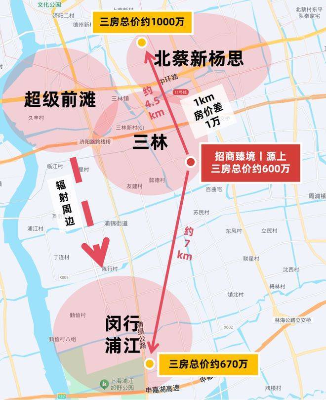 而招商臻境单价则依旧处于性价比十足的“6”字头,建筑面积约95㎡三房总价仅约600级,相比之下,北面直线距离约4.5km的北蔡新杨思,板块在售新房单价陆续超10万+/㎡,想买三房预算需破千万,每隔1km房价就几乎相差1万。
