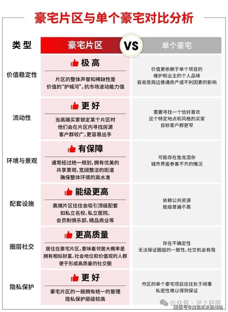 价值稳定性、流动性、环境与景观、配套设施、圈层、隐私 等维度,好房君做了两者的对比,供大家参考:
