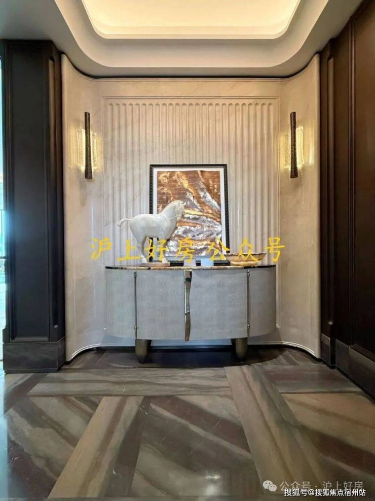 例如入户玄关铺设有 “石材皇后”鱼肚印象” ,这种级别的奢石在很多顶豪项目中通常仅作局部镶嵌