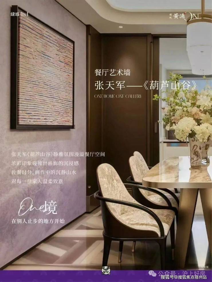 走进室内,艺术感更显细腻: 餐厅一侧墙面 点缀着张天军《葫芦山谷》系列独家共创画作;