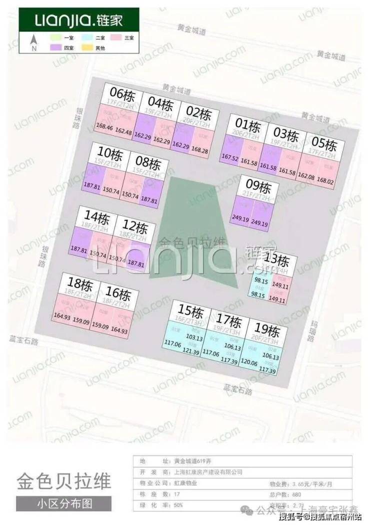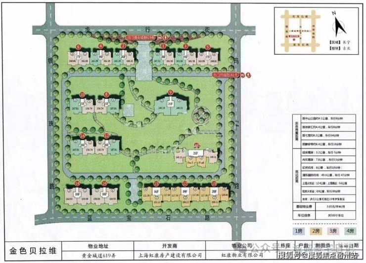 「金色贝拉维」上海虹康房地产(国资委)倾力打造,于 2007年建成共17个单元,合计684户。户型以 2-4房为主,建筑面积在 98-249㎡左右,客户是群体多 以改善型为主