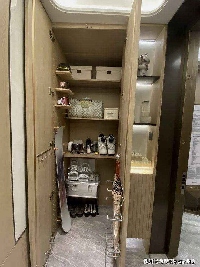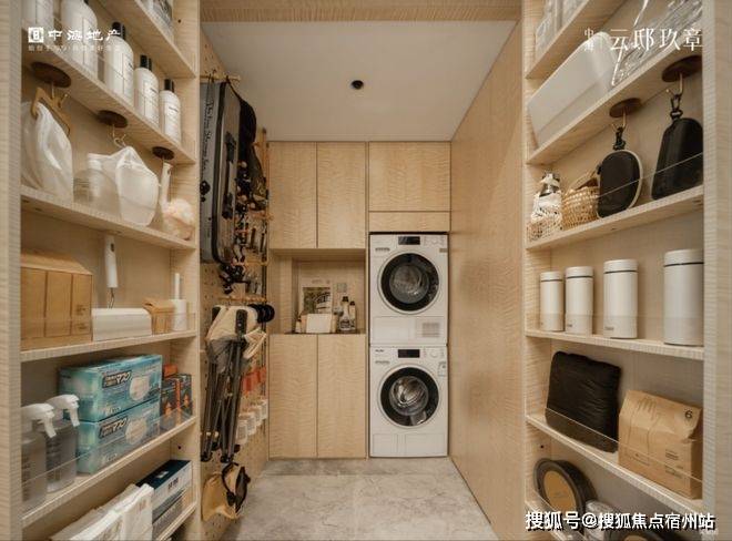 第三是‘奢’:细节奢配。进门即享一个全交付的独立家政储藏间,洞洞板、储物柜全部做好,行李箱、杂物、清洁工具统统收纳其中,关上门家立刻整洁如初。这种配置通常只在200平以上的豪宅里才会出现。