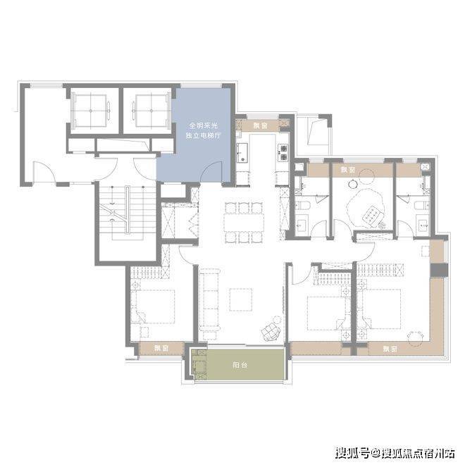 所谓实得率,即户内可实际使用面积与建筑面积的比例,独用电梯厅、可利用飘窗与阳台均可提升空间效率,直接决定了生活场景的落地边界。