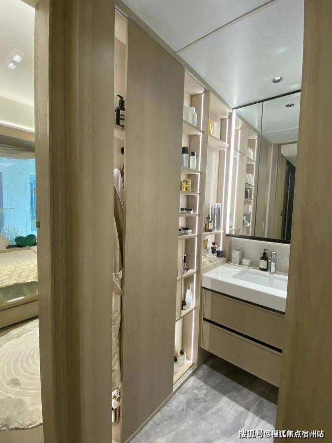 中海云邸玖章售楼处电话:400-856-9058次卫的北墙面向宽敞的北卧室借了300mm的宽度,满足了卫生间对消耗品的储藏需求。样板间做了移门设计,近洗漱台设置了七层隔板置物架,满足全套护肤品的收纳。中海云邸玖章售楼处电话:400-856-9058