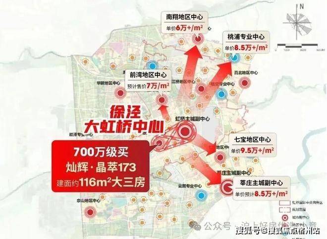 据销售人员透露,灿辉·晶萃173的总价在700-1000万左右,116㎡改善大三房总价700万级。而同样700万,只能买七宝、莘庄、桃浦等板块的90㎡紧凑户型,或者买南翔、华漕的100㎡户型。这些板块比起徐泾如何?