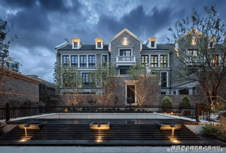 项目采用天然石材和现代工艺相结合的手法,水景池底则选用意大利进口奢石金钻,大门选用风貌复古红洞石材。