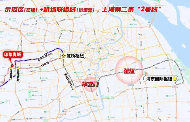 但这还不是全部,17号线+示范区线 左手长三角一体化、华为,右手前湾、大虹桥总部商办,并通过虹桥枢纽,串联2号线及正在试运营的机场联络线, 把市中心、徐汇、闵行、张江等高能板块都纳入印象青城的通勤版图。