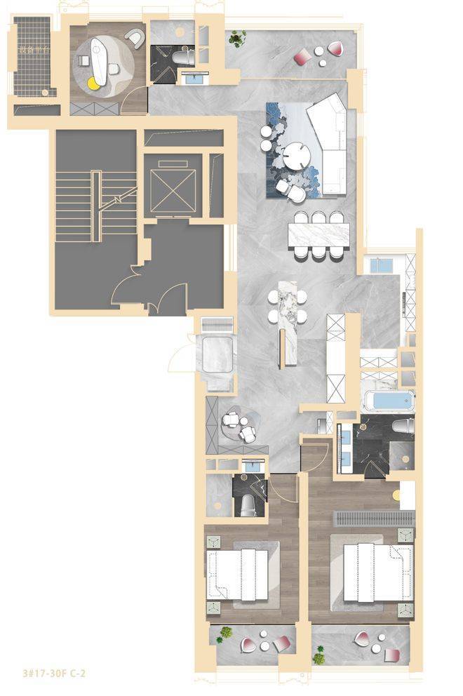 项目中心坐落的中央景观规模约3000㎡,周边环绕着四座建筑,其中三幢为超高层设计,整体布局高低兼顾,启承有序,开阖有度,塑造城市云端生活新方式。