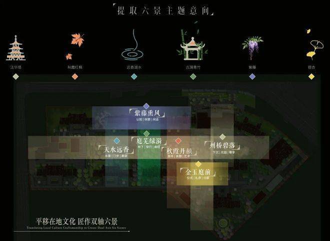 建筑们围合出的中心花园中,州桥老街、秋霞圃、远香湖、古猗园、紫藤园、银杏古树等嘉定6景被南山地产提炼、转译,形成了具有在地文化特色的6大景观主题空间。