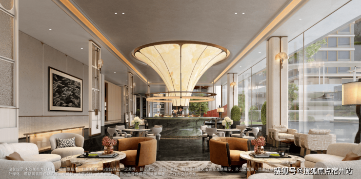 上方悬垂的艺术吊灯 并非一味追求宏大,而是更注重造型的现代感与光影的层次,光线柔和地洒下来,营造出静谧、高级的氛围。
