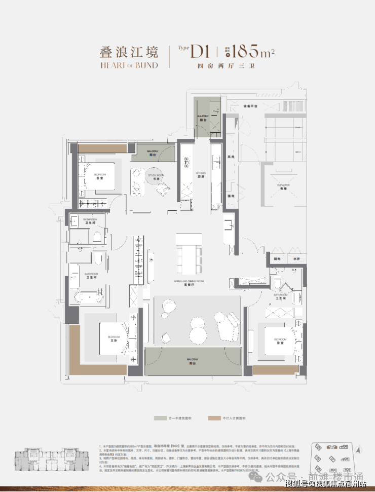 185㎡:四房两厅三卫,总价约2000万-2500万;