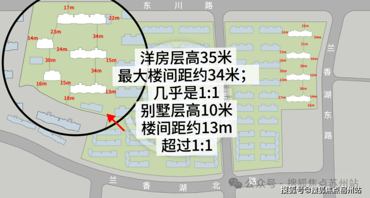 10米高的别墅,楼间距做到了13m左右!墅境洋房35米的层高,最大的楼间距做到了34m!