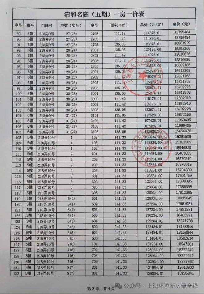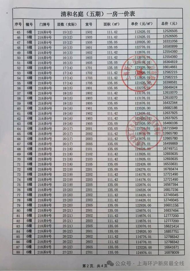 最新一房一价表公示 :