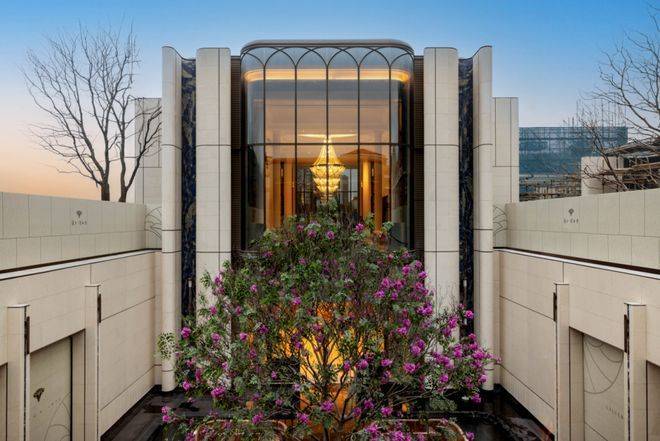 门庭延街的外立面,以精工定制弧形贝金米黄大理石为主调,镶嵌典藏级老虎玉大理石,点缀古铜色现代海派艺术感灯器,整体呈现出百年海派的贵雅气质。