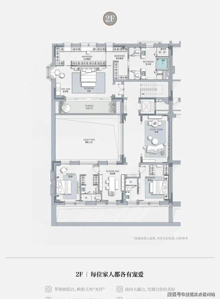 客厅互通,彰显家族生活的轩阔厅堂,2F家庭层,儿女的幸福与陪伴皆在左右,3F总裁套房式Penthouse,用具象的尺度描写人生成就的高度。