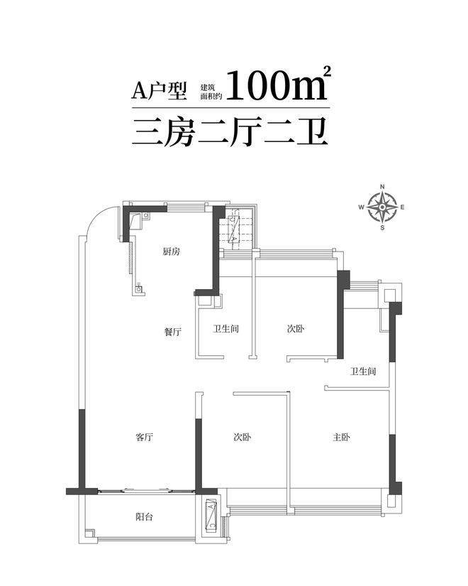 建筑面积约100㎡雅致三房两卫,满足二娃时代