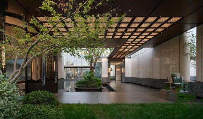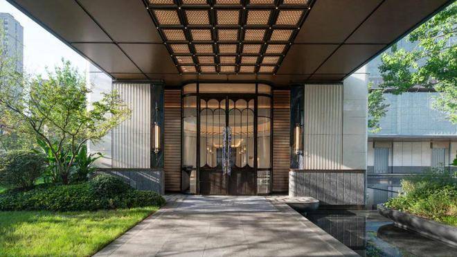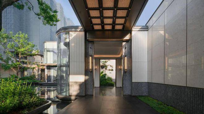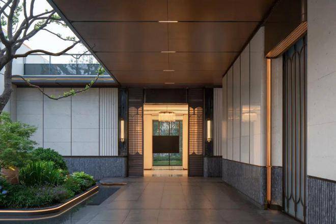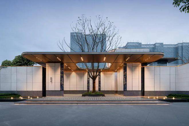 设计师巧妙汲取了香樟花园的灵感,招商臻境门庭入口处香樟破顶而出,是自然与都市的互融共生,是归家心绪的符号转场,作为对都市原乡理念的创新诠释,是空间的点睛之笔。自然元素穿透建筑的拱形立面,实现了生态与构造的和谐共生,为居住者提供了与自然对话的沉浸式体验。
