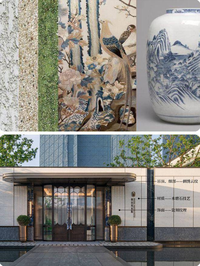 招商臻境示范区兼蓄三林在地非遗文化,千年的非遗灵魂被轻轻唤醒。门头两侧的瓷刻纹理,雨棚顶上的云纹绣图,将瓷刻和刺绣艺术巧妙融入当代美学。每一道纹理,皆是匠人心语,古老技艺在现代语境下绽放新姿。