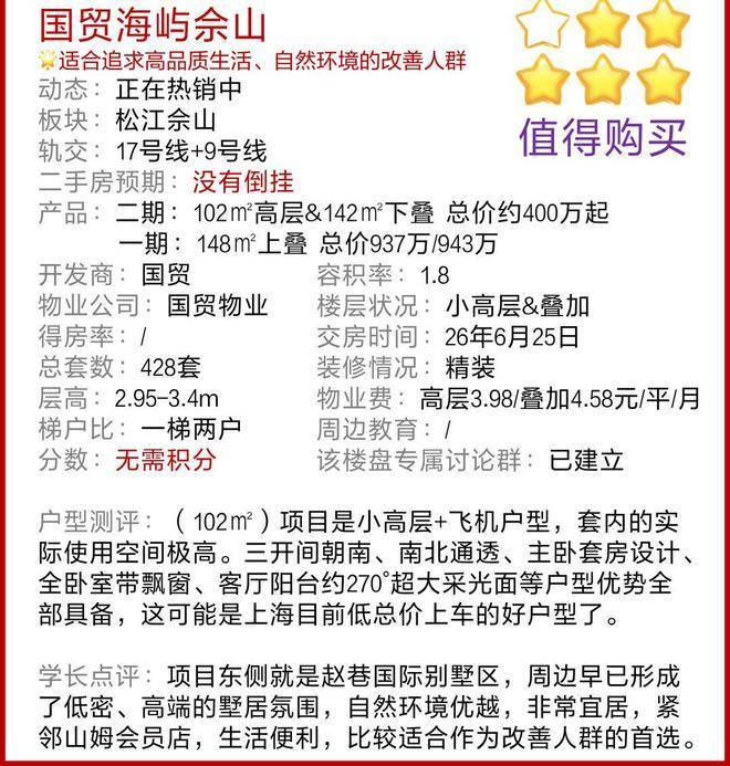 总结:2025年想低总价上车墅区产品,国贸海屿佘山绝对是不可错过的产品。佘山这样的地段自带基因优势。同时承接虹桥大科创产业和G60佘山高科智造产业园,双重产业加持,既有当下,又有未来!