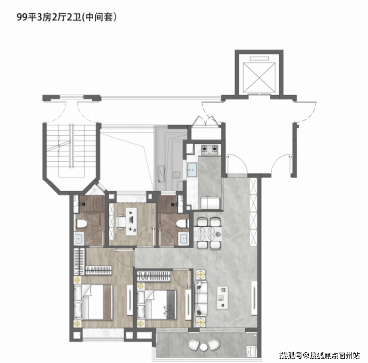 建面约99㎡3室2厅2卫户型,做到了 三开间朝南+超大阳台+动静分离+主卧套房设计,延伸了室内实际可使用面积,采光、通透性都非常不错。