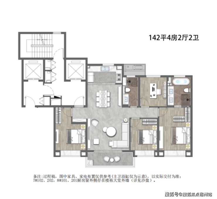 建面约142㎡4室2厅2卫户型, 2梯2户设计,大大提升了入户 尊贵感和私密性