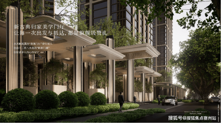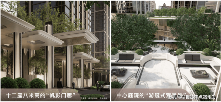第一重:旗舰门厅与十二帆影 :业主先穿过寓意“上海之帆”的旗舰门厅,再路过12座8米高的“帆影门廊”,建筑语汇先将滨江的航海文化融入归家礼序。