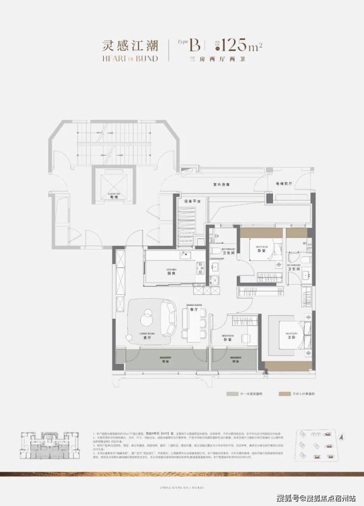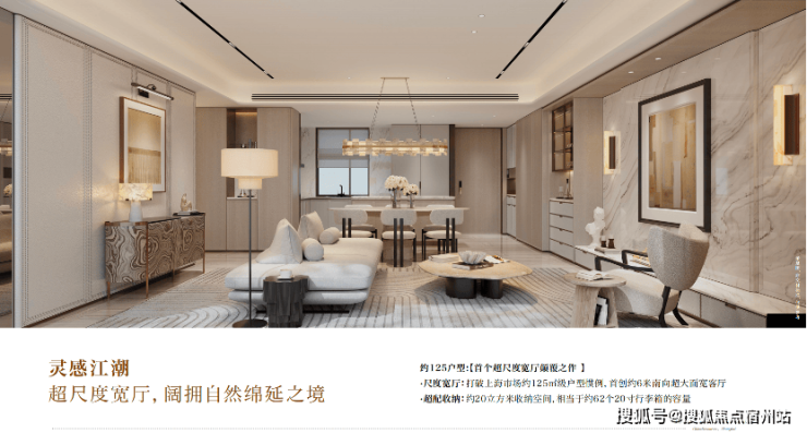 「灵感江潮」 :约125㎡户型,首创约6米南向超大面宽客厅,边户可拓展至近9米面宽,配独立岛台,超配约20m³收纳系统。