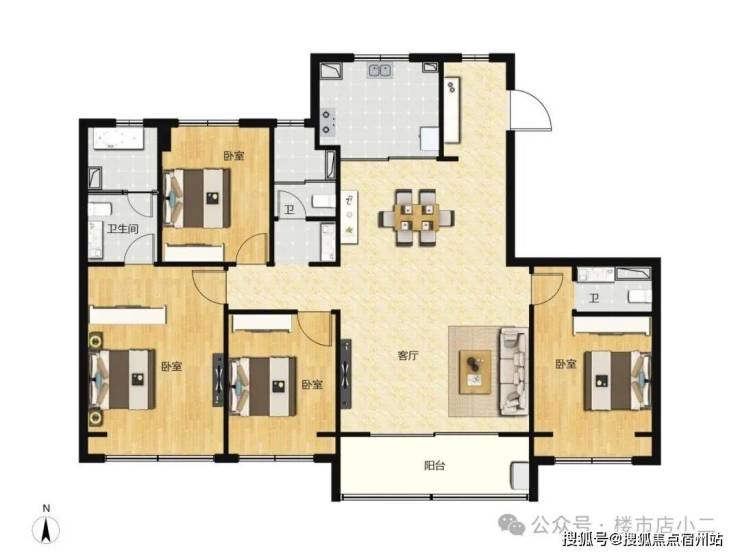 99㎡的户型,三个房间都可以做卧室,无论二胎或三代同堂皆可。