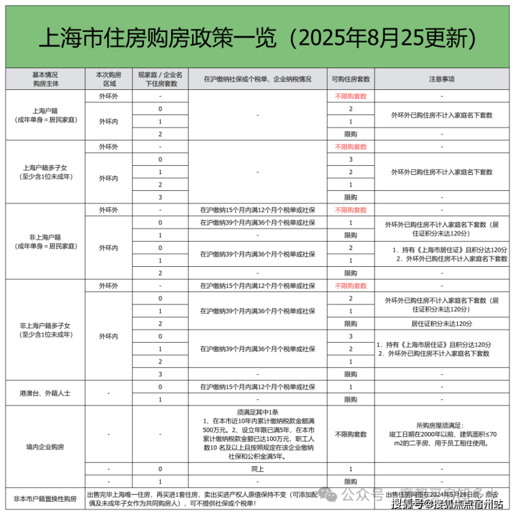 非沪籍居民家庭/单身人士:社保/个税满1年可在外环外不限购;满3年可在外环内限购1套